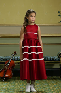 Description: This Matte Satin dress features a jewel neckline and ribbon and beaded bow accents on the bodice and on the full skirt. 4/6/8-week rush services available. Consult with your local retailer for availability and fee.