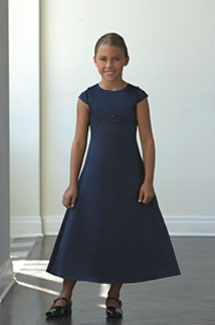 Description: French Satin dress with a jewel neck. Beading and embroidery accented short cap sleeves and empire waist. Back has buttons running to hemline. Matches bridesmaids style 7109. 4/6/8-week rush services available. Consult with your local retailer for availability and fee.