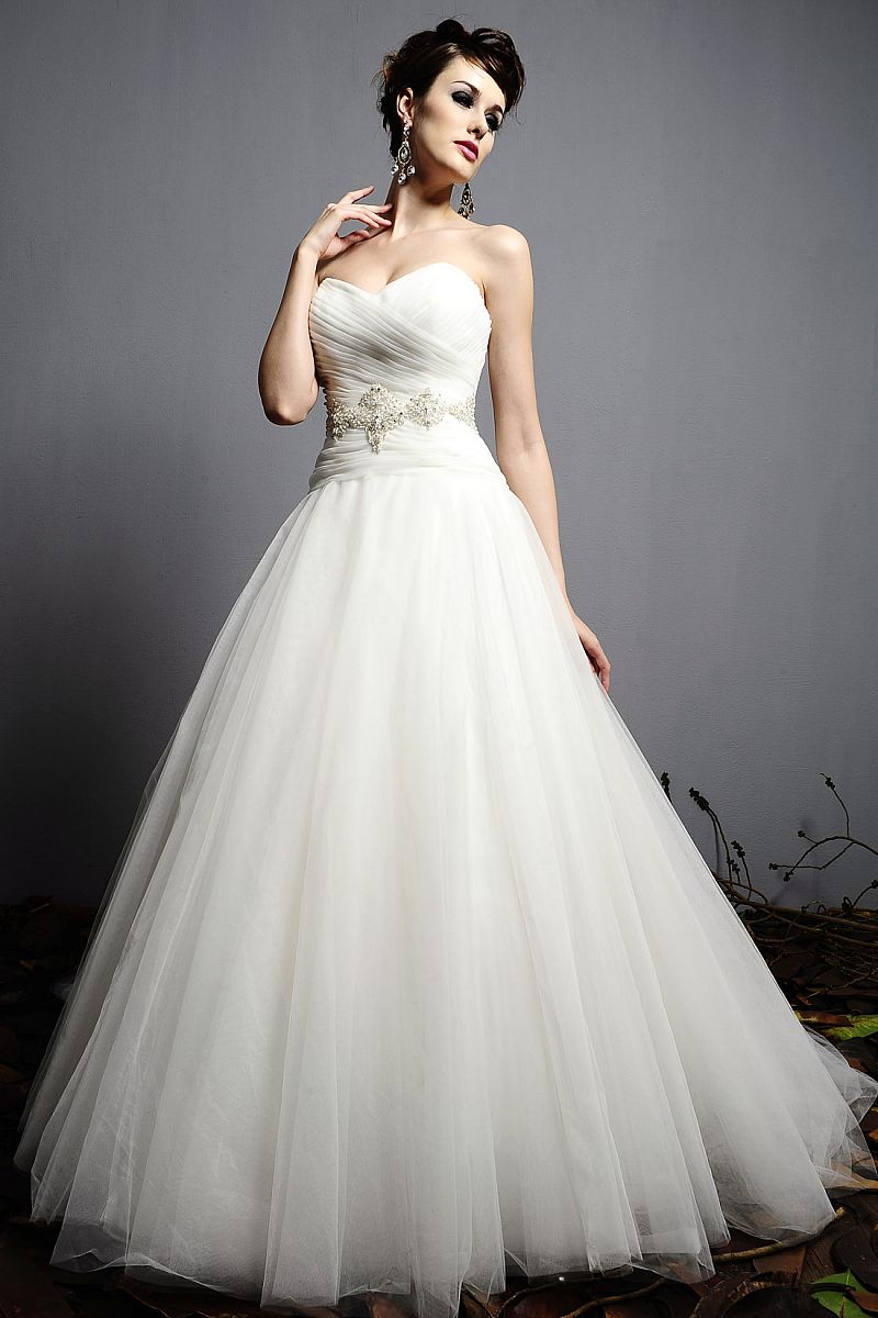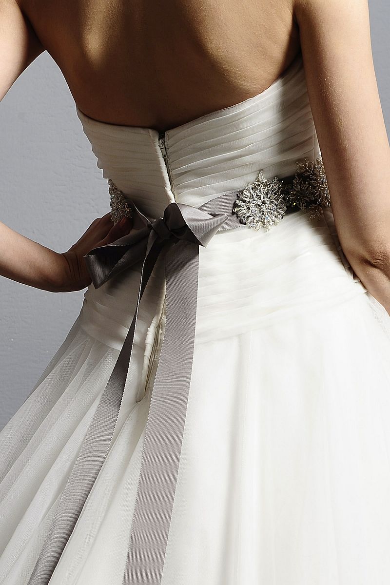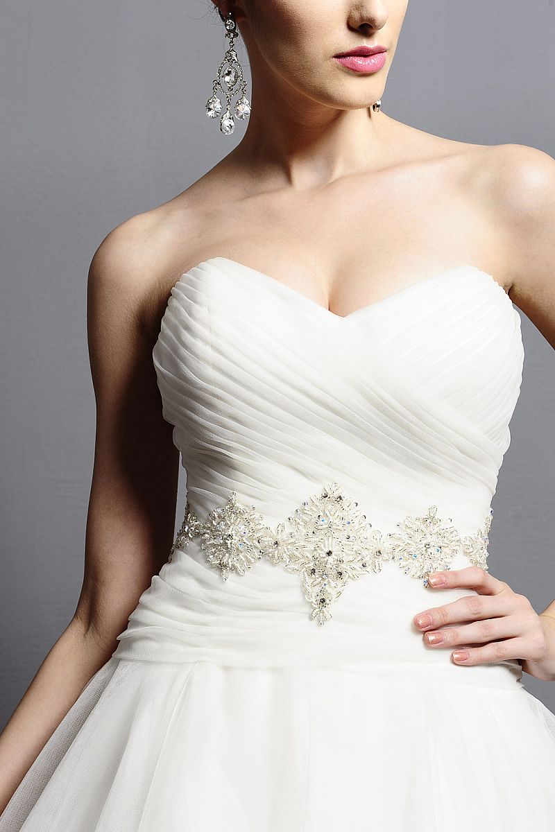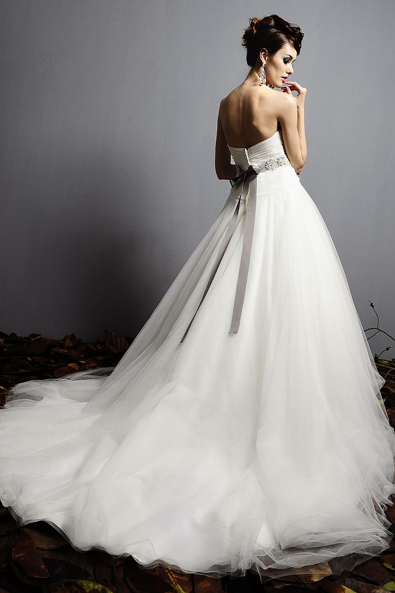 | Fantastic A-line ball gown in Tulle featuring a fully gathered Tulle overlay wrap across bodice that has been accented at the natural waist with delicate crystal beading and a Grosgrain ribbon self tying bow. The inverted round dropped waistline sits above a multi-layered tulle skirt that finishes with a chapel length train. Available in all white, all ivory o in combination w/platinum. This style can be ordered with an 8-week rush, fees apply. |