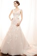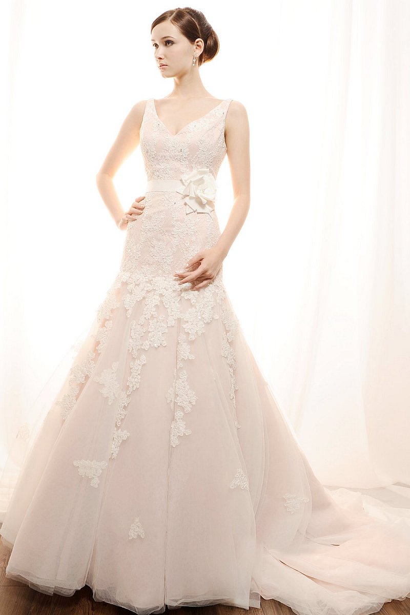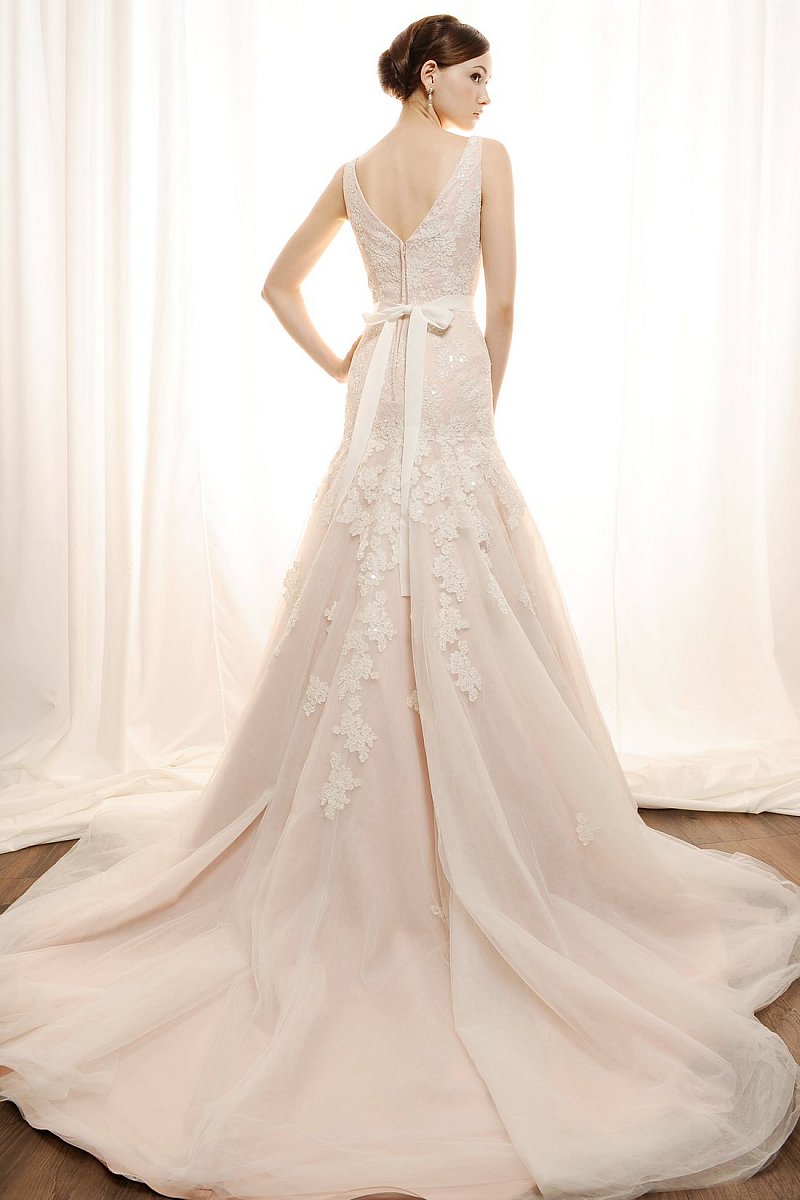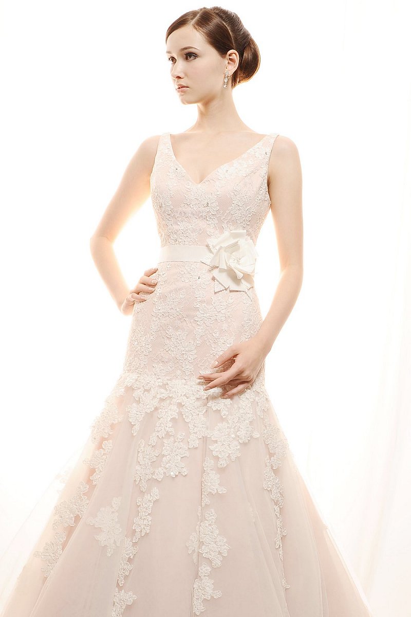 | Gorgeous tank style V-neck gown in Lace and Tulle. The lace has been delicately beaded throughout with ivory sequins and accented at the natural waistline with a grosgrain ribbon belt and floral corsage. The circular cut tulle skirt leads into a chapel length train. Available in white, ivory, or in combination w/rose. |
