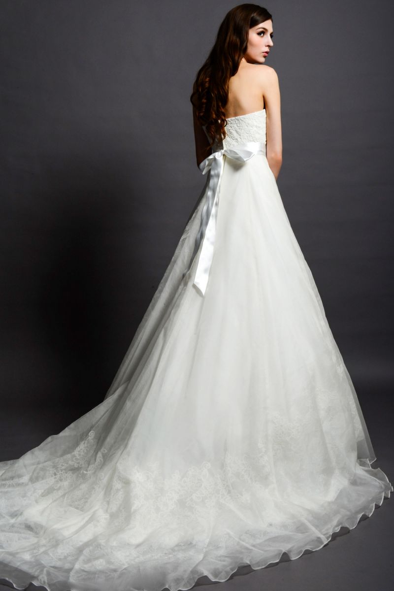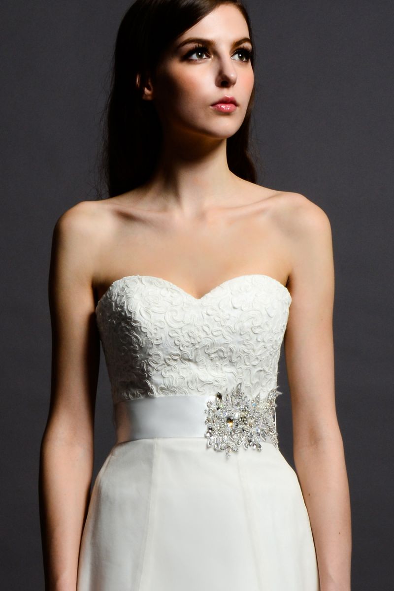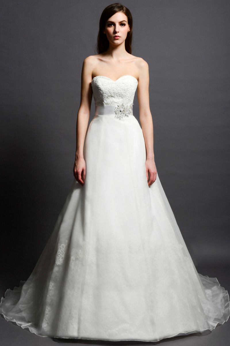 A beautiful A-line gown made strapless with a sweetheart lace bodice and crystallized beaded belt. The lace-accent skirt has a Silky Organza overlay and a chapel length train. Available in Ivory only. The detachable belt can also be ordered separately. (See BLT052)
