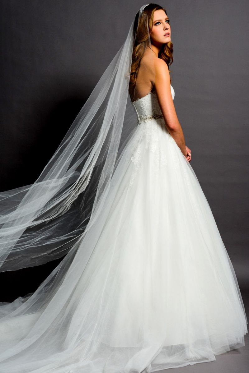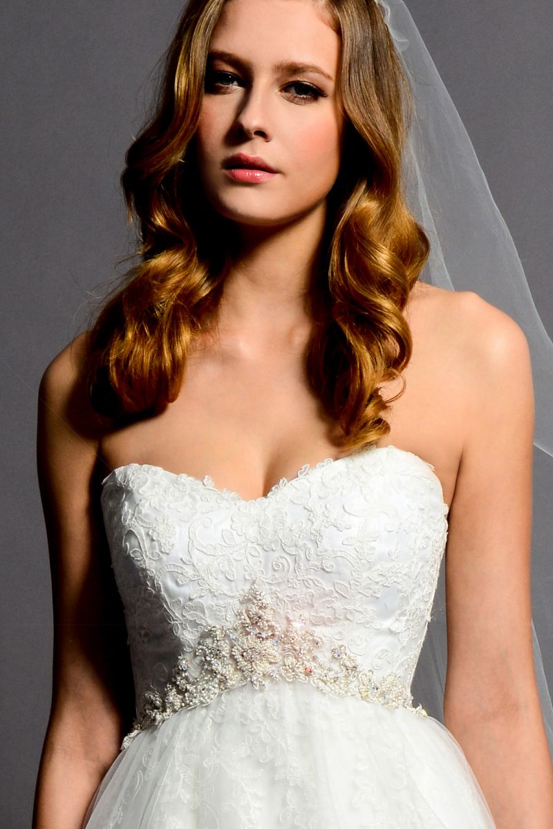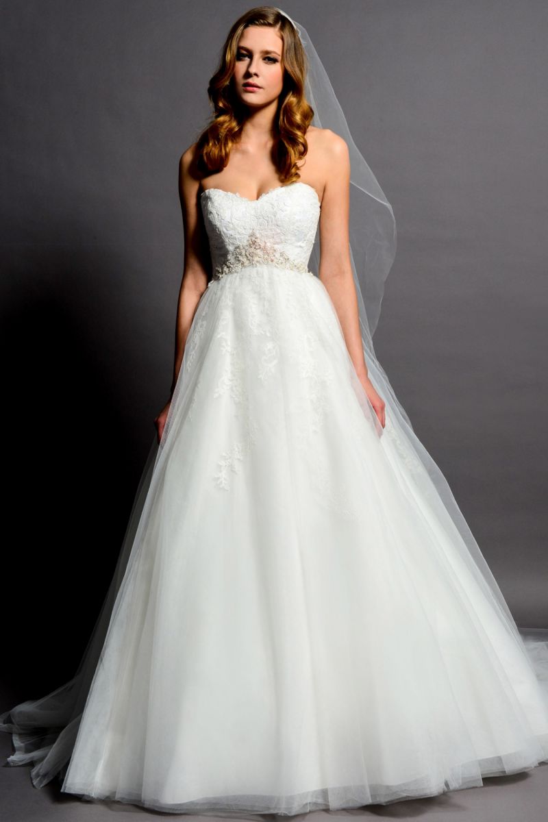 A romantic ball gown made strapless with a sweetheart Lace bodice and heavily bedazzled with crystal beading at the waist. The Tulle skirt is embellished with lace appliques and finished with a chapel length train. Available in White or Ivory.