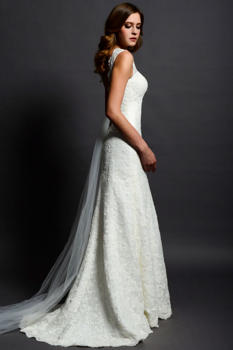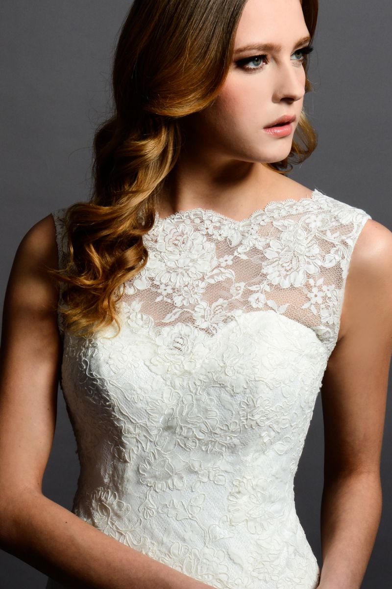 This beautiful all Lace gown is made with a sweetheart bodice and sheer boat neckline leading to an open back finished with tulle streamers and a chapel length train. Available in White or Ivory.