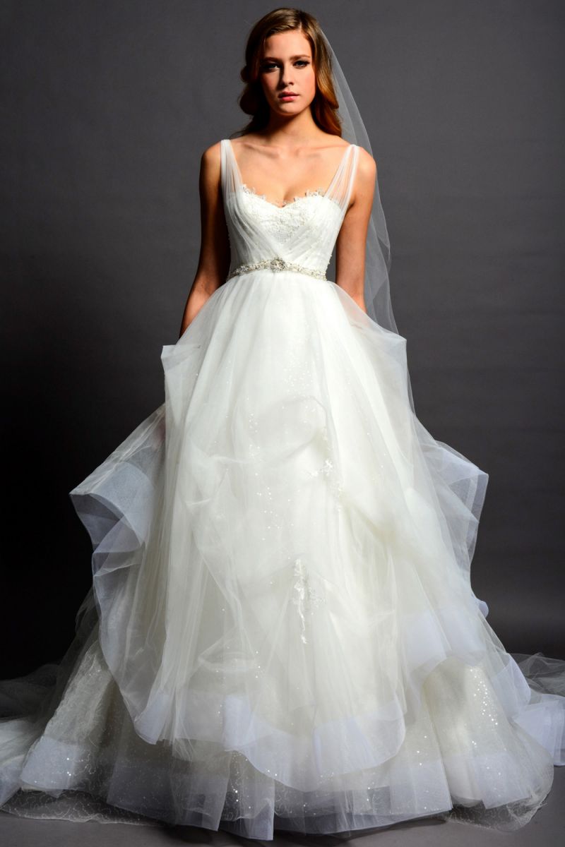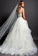 A grand ball gown in Sequin Tulle with pick ups for a full tulle skirt. The Lace sweetheart bodice is made with sheer straps and finishes with a crystallized beaded trim at the waist. Available in White or Ivory.