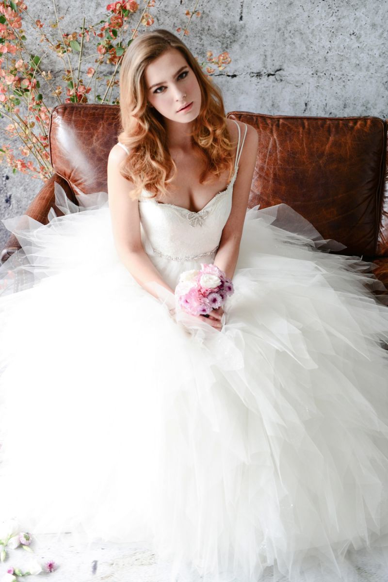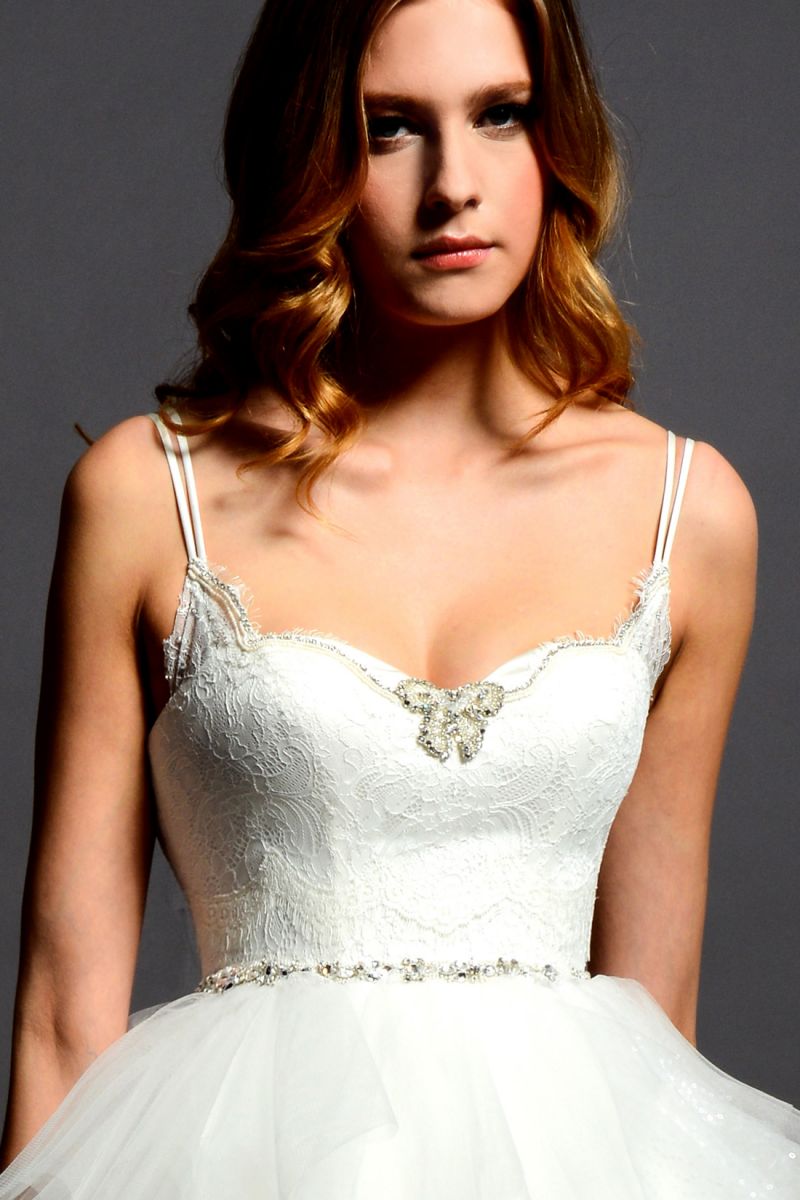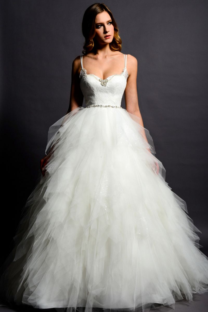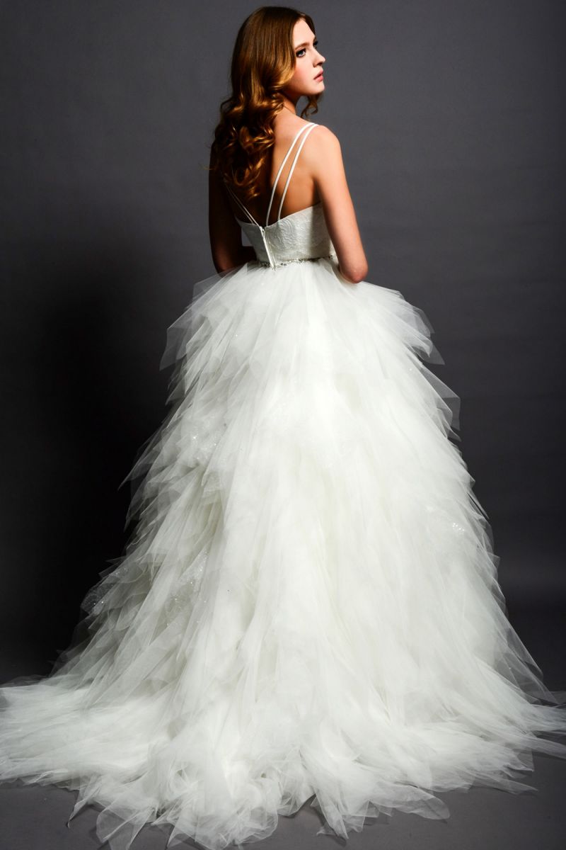 A stunning ball gown made with Lace sweetheart bodice adorned with crystallized beading. The full skirt is embellished with Sequin Tulle handkerchief ruffles and chapel length train. Available in White or Ivory.