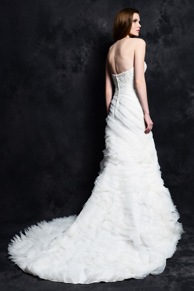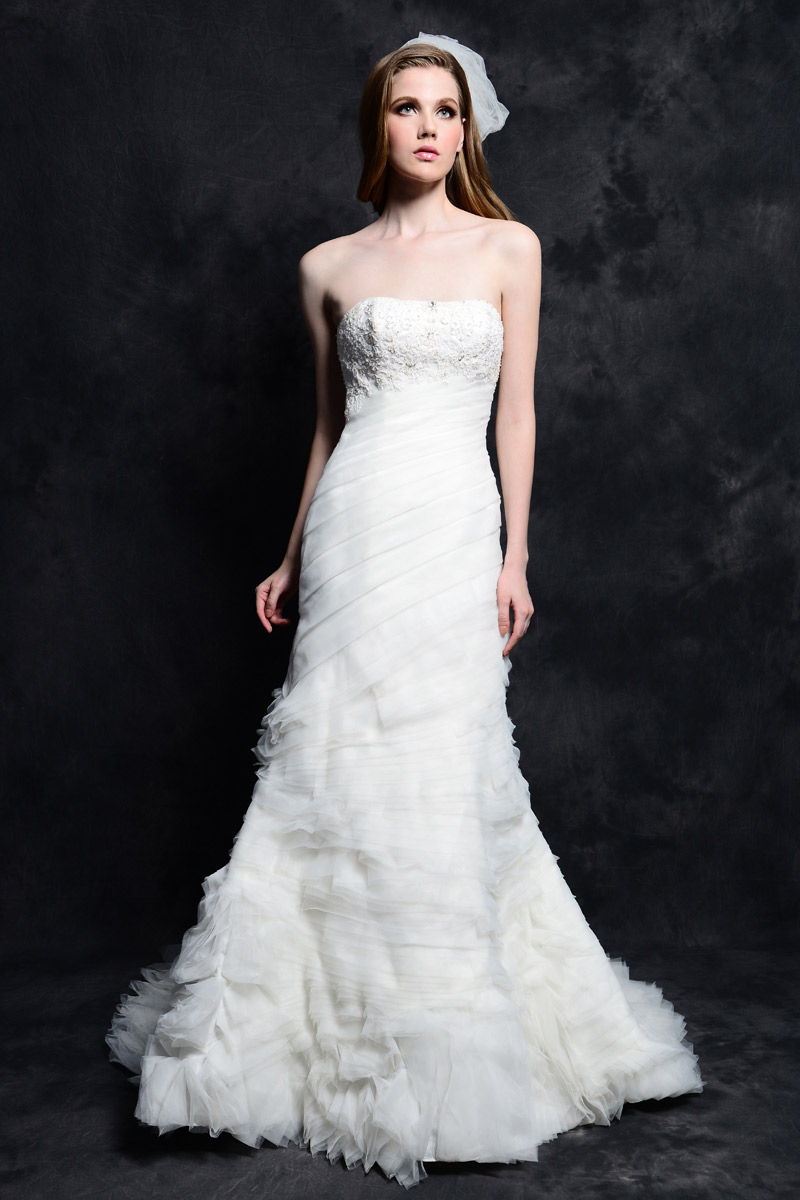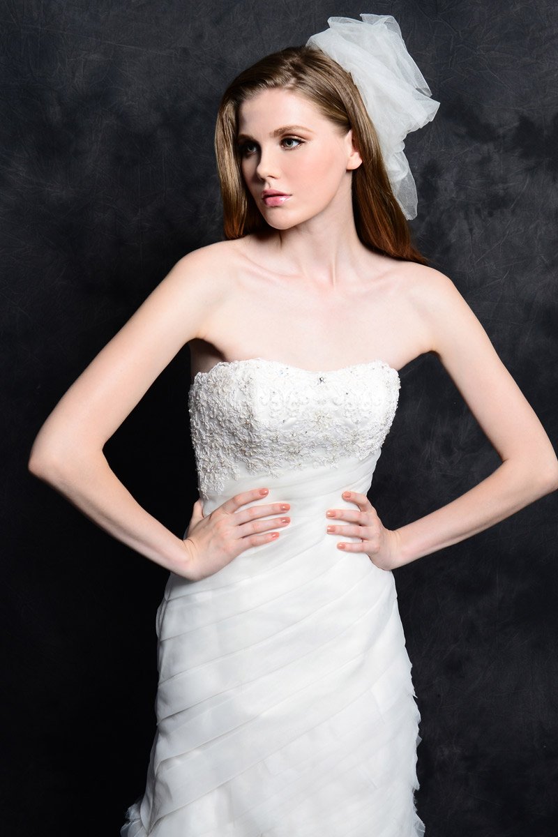A beautiful gown made in Royal Duchess Satin and Organza with a strapless bodice fully covered in lace and beading. The fitted A-line skirt has asymmetrical pleats leading to layers of tulle and organza and a chapel length train. Available in White or Ivory.
