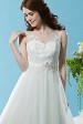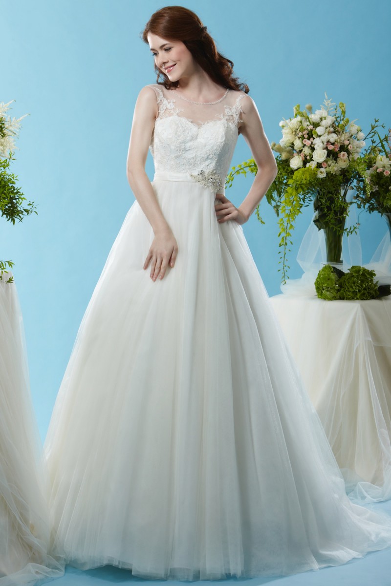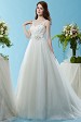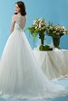 | This gorgeous Tulle ball gown is made with a sweetheart bodice and sheer illusion boatneck trimmed with beading. The bodice is adorned with delicate lace and accent at the waist with a dazzling cluster of beading. This gown is finished with a chapel length train. Available in White or Ivory. |