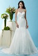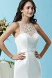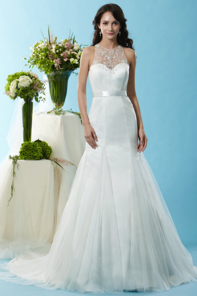 An alluring Royal Duchess Satin gown made with Tulle overlay. The sweetheart bodice features a sheer jewel neckline and heavily embelllished with beading. This gown is finished with a ribbon belt at the waist and a chapel length train. Available in Ivory only.